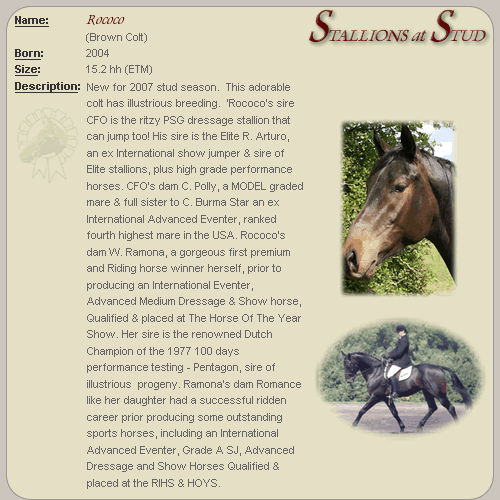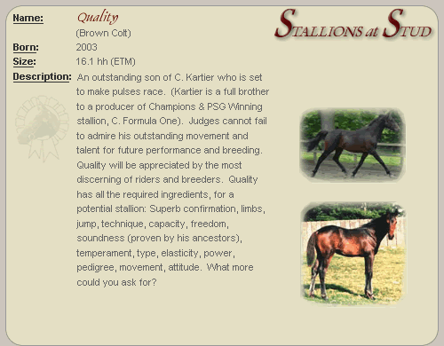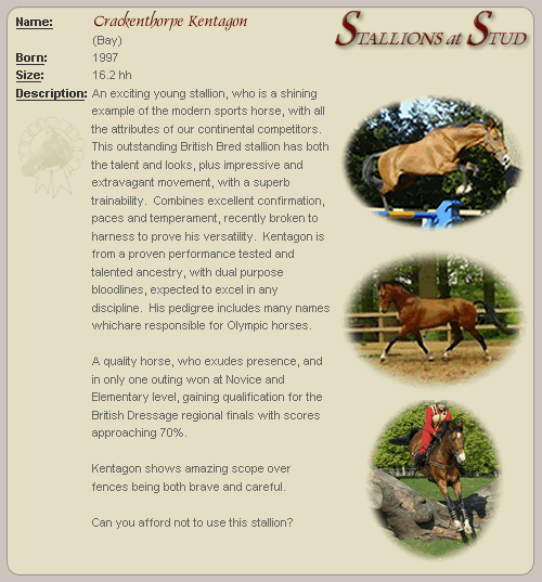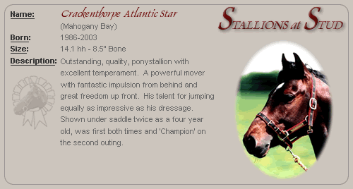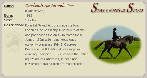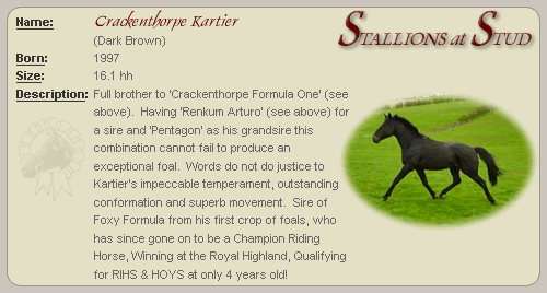 As can be viewed below, Crackenthorpe Stud does not expect you to have to compromise, this is why their stallions have "work with you" temperaments, top performance bloodlines, correct conformation, and paces to match. "A friendly, commonsense approach is assured and our personal attention is given to all mares at the Crackenthorpe Stud" Anne Chappelhow. |
